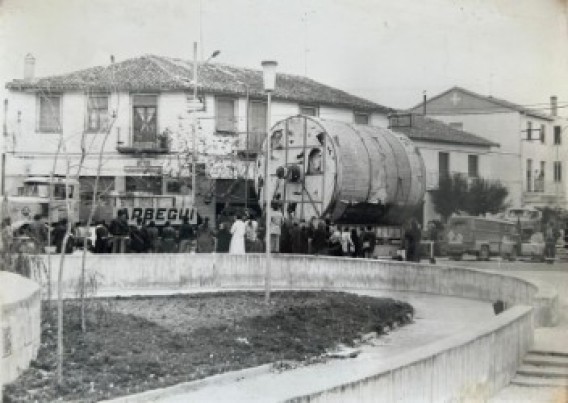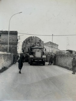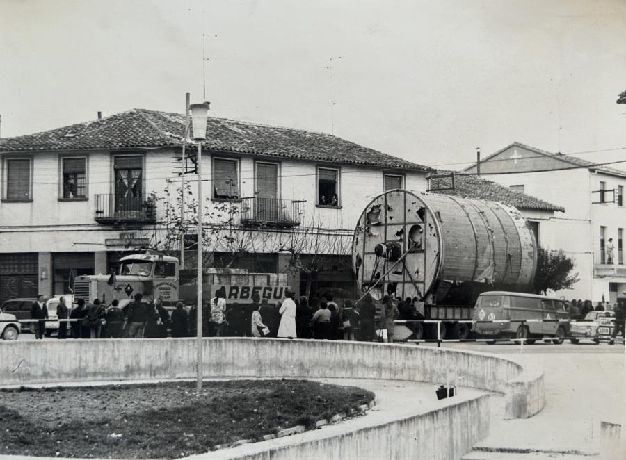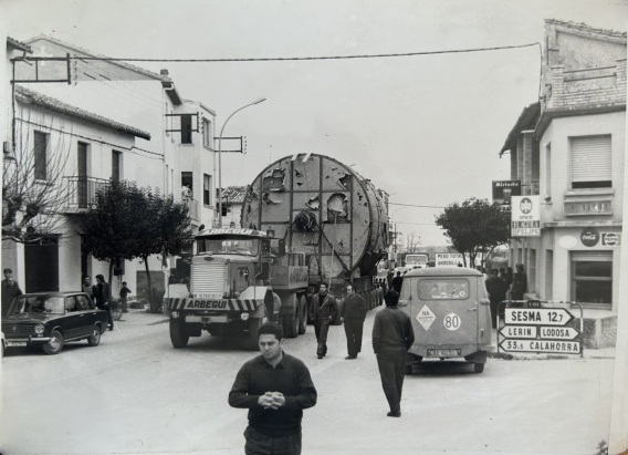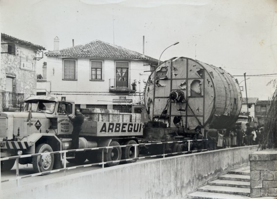 Ya llega la gran máquina que se había de instalar en nuestra Papelera a lomos de un camión de gran tonelaje. Según muestran los letreros, el camión pertenece a la empresa de transportes especiales Arbegui, de Bilbao y lleva matrícula de Madrid. Estamos en la esquina de Galeras. En las orillas de la carretera, se ve a la gente expectante y, entre ellos, de nuevo la autoridad, un guardia civil. Con dificultad, reconozco a José Macua, que parece posar para la ocasión. Casi quiero adivinar en el fondo izquierda a gente que ha salido de la fragua de mi tío y sigue observando la lenta marcha de semejante máquina. Una carretera sin aceras.