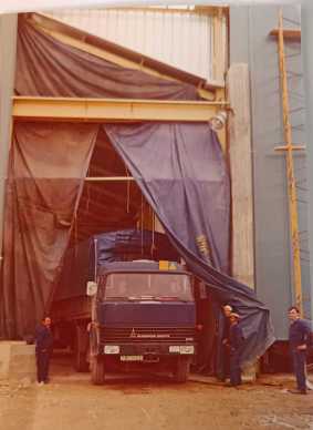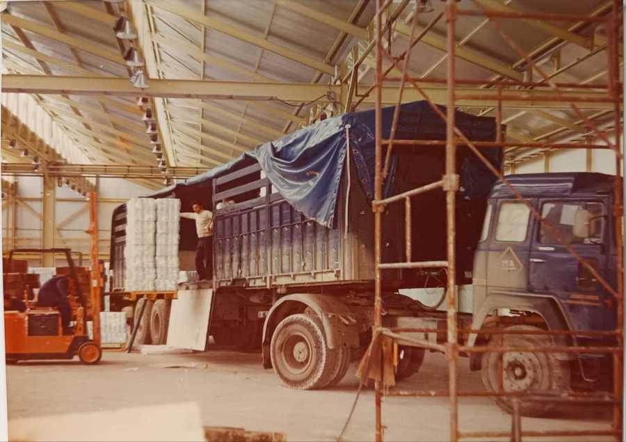 Se abre el telón y sale el camión cargado con destino a un punto cualquiera de la geografía española. Ese camión azul, Magirus Deutz, es conducido por un joven de Allo, Javier García, El Rojas. No estuvo muchos años de camionero. Cuando colgó el volante se convirtió en nuestro mecánico de cabecera. Él dice que tiene el honor de haber sido el primer camión que salió cargado de la fábrica y, desde luego, no faltó expectación alrededor. Parece que le van haciendo el pasillo como a los deportistas campeones, ya que el momento no merece menos. A los mandos del camión, como decía antes, El Rojas, de copiloto y todo orgulloso Julián Larrainzar, El Pelaire, y haciendo pasillo al Magirus que hasta el nombre lo tiene portentoso, a la izquierda, José Iduriaga, El Royo, a la derecha Gonzalo Garayoa, uno de Lerín y el otro nos da que es Romualdo García. Ese primer camión salió con destino a Alicante.