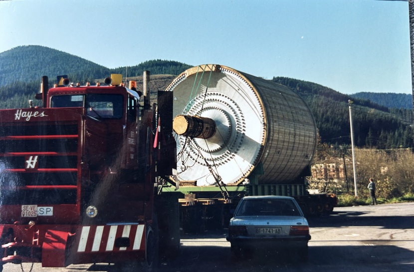 Aquí tenemos un ejemplo de uno de los camiones que se compraron para dar servicio a la papelera. Ahí se ve al carretillero que eleva los rollos de papel hasta el remolque y dentro espera otro operario para colocar de forma adecuada cada palet dentro de la cama del camión. La foto es de cuando es, está tomada desde muy lejos y ello nos impide identificar a las dos personas que aparecen. El camión era nuevo, pero estaba muy sucio por las lluvias caídas.