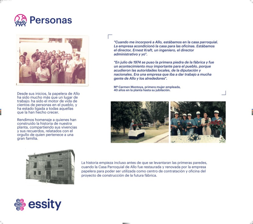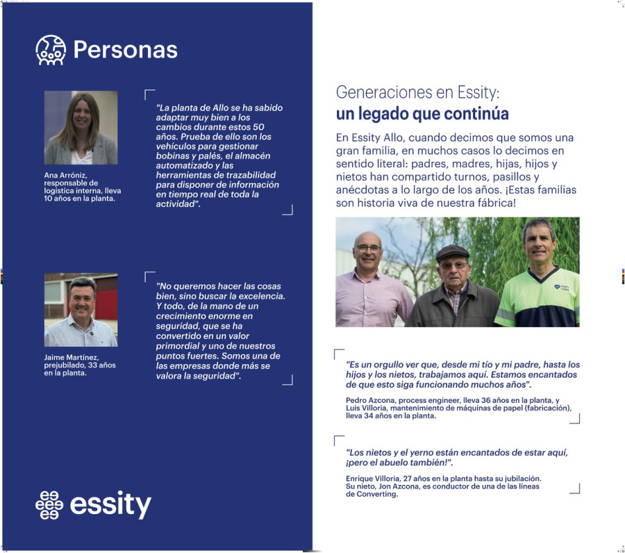 El programa de las fiestas patronales de Allo 2025 recoge una entrevista con el citado actual director de la empresa ESSITY, D. Antonio Martínez, puesto que ocupa hace prácticamente una década. A lo largo de la entrevista va contando la historia de nuestra papelera desde sus inicios hasta el momento actual. Nos cuenta cómo la planta se ha ido modernizando a lo largo de los años a base de fuertes inversiones en nuevas tecnologías, inversiones que han marcado hitos en estos 50 años de historia y que han apostado por un futuro saludable respetando siempre el medio ambiente. Nos cuenta cómo se ha pasado de lo mecánico a lo digital con grandes avances en la forma de producir pero sin descuidar al mismo tiempo la seguridad de los trabajadores, objetivo este prioritario en la política de empresa como él nos relata. Esta jugosa entrevista la habéis podido saborear repito, en el programa de fiesta de 2025, por ello no será necesario extenderme más en datos que están al alcance de todos. Solamente un dato que me llamó la atención. Cuenta el director que la primera bobina de papel se fabricó el día 7 de julio de 1975, San Fermín. Parece ser que el santo pamplonica extendió sus tentáculos hasta Allo para desearles a sus habitantes un futuro halagüeño. También quiero recordar que en el año 2025, y con motivo del 50 aniversario, se celebró en el mes de junio una jornada de puertas abiertas a la cual acudieron más de 1.200 personas que pudieron disfrutar viendo las instalaciones de la fábrica y su funcionamiento. Otro dato significativo es el que nos cuenta cómo el 60% de los 400 trabajadores viven en Allo o en pueblos cercanos y el 40% restante se reparten entre Logroño y Pamplona.