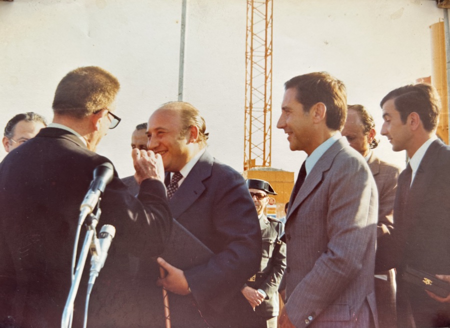 Parece que es Amadeo Marco quien atiende a algún jefe de la Papelera. Por detrás, se asoma la cabeza del Alcalde de Allo que, en aquel momento, era Pedro Pérez de Ciriza. También podemos observar a la autoridad competente -Guardia Civil-. Es momento de obras. Se ve una grúa por detrás. Tal vez, se corresponde a la colocación de la primera piedra. Esos micrófonos en medio del campo así nos lo indican .