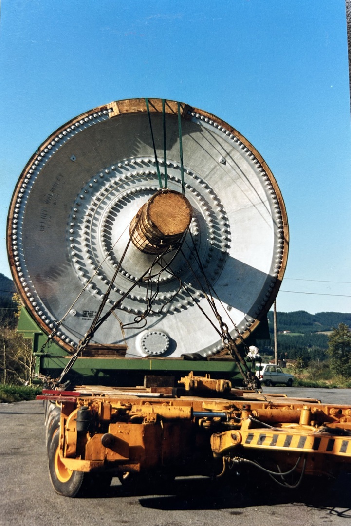 ¡Ala! ¡Que ya hemos llegado! Ya va entrando la máquina a su ubicación definitiva. Lo que más me llama la atención, es el número de ruedas que lleva el camión. Las cuento por curiosidad: 11 pares a cada lado, 22 ruedas y, si sumamos la del otro lado, 44. ¿Cuántos km ha hecho?