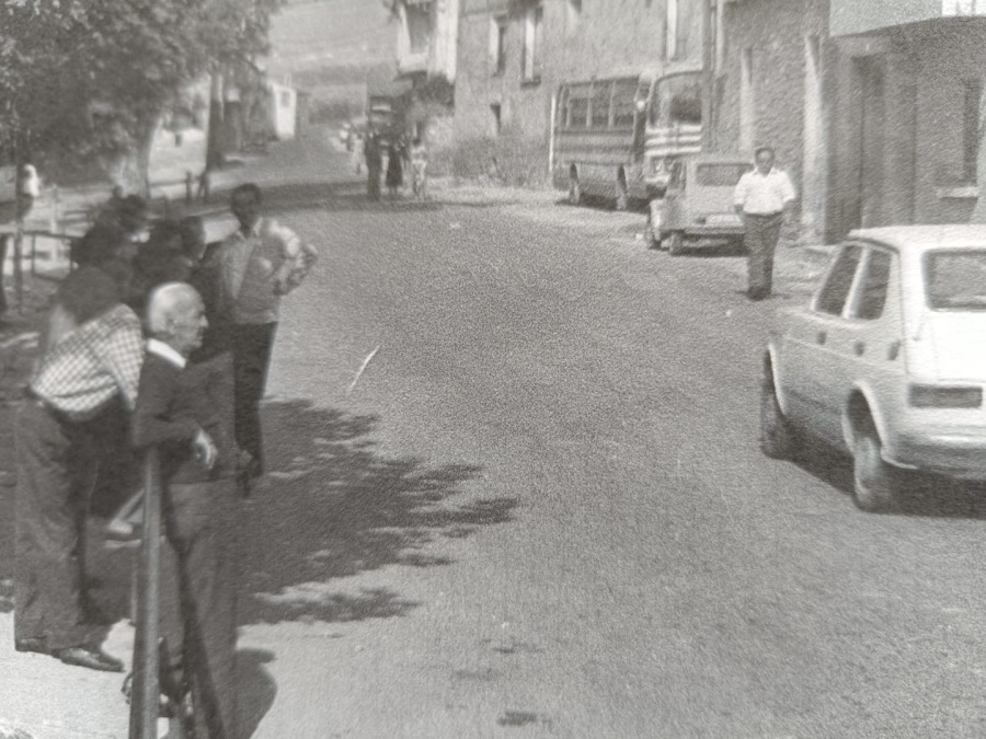 Siempre nos ha gustado poner nombre a las personas que aparecen en las fotografías. Parece que identificar a las personas da más emotividad y sentimiento a la foto. A la derecha de la imagen caminando y con camisa blanca se ve a Alberto Echeverría. Del grupo que está a la izquierda, en entretenida tertulia y apoyados en la barandilla, nos cuesta identificar a alguien, bien por desconocimiento o por la falta de nitidez de la imagen. Por la ropa que usan parece el inicio del verano apreciándose además como se cobijan a la sombra de los frondosos plátanos. Es nuestro paseo de La Fuente, lugar habitual de tertulias cuando el tiempo lo permite. Parece que la baranda ya ha sustituido al antiguo paredón como punto neurálgico para la misma función: observar desde un lugar privilegiado todo lo que pasaba por la carretera que es como decir todo lo que se movía de novedoso en el pueblo.