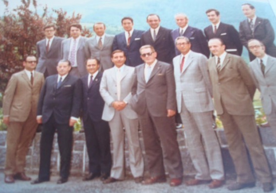 Vemos en la primera fila al Vicepresidente Amadeo Marco ( el de gafas oscuras) y Fortun. A la derecha de Marco, con traje y corbata clara, está Lorenzo Marco Sarrió, presidente del Consejo de Administración de la Papelera de Leiza, miembro de una familia con tradición papelera en Cataluña.