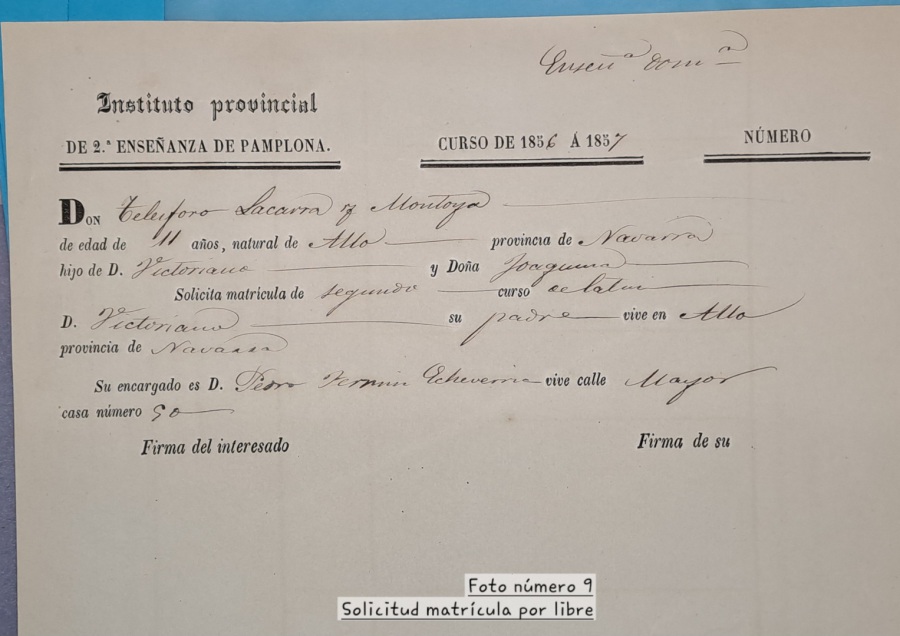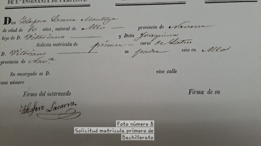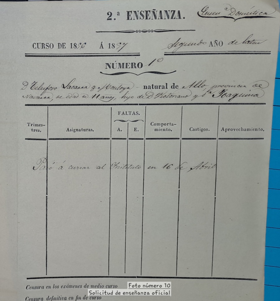 Pasados diez años de la creación oficial del Instituto, Telesforo Lacarra Montoya, con 10 años de edad, solicita matrícula de primer curso de latín para el curso, valga la redundancia, 1855- 1856.
